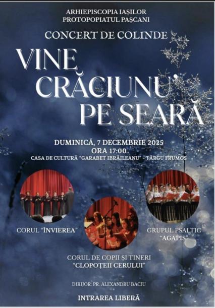 Arhiepiscopia Iașilor, prin Protopopiatul Pașcani, organizează, de la ora 17.00, concertul de colinde „Vine Crăciunu’ pe seară”. Evenimentul va avea loc la Casa de Cultură „Garabet Ibrăileanu” din Târgu Frumos. Pe scenă vor urca Corul „Învierea”, Grupul psaltic „Agapis” și Corul de copii și tineri „Clopoțeii Cerului”, care vor oferi publicului un repertoriu variat de colinde tradiționale. Întregul concert se va desfășura sub bagheta dirijorului, Pr. Alexandru Baciu. Accesul publicului este liber.